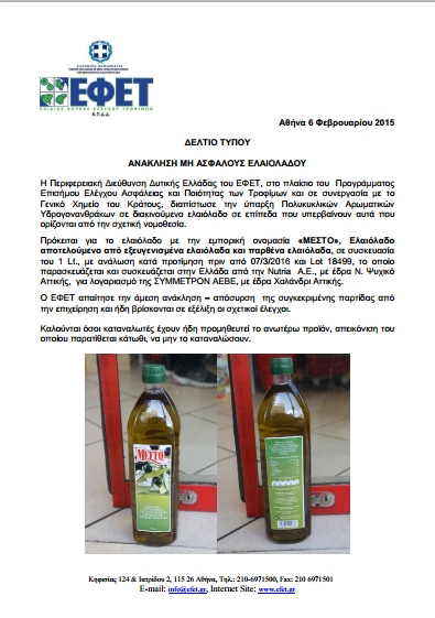 Όπως αναφέρεται σε σχετική ανακοίνωση, πρόκειται για το ελαιόλαδο με την εμπορική ονομασία «ΜΕΣΤΟ», ελαιόλαδο αποτελούμενο από εξευγενισμένα ελαιόλαδα και παρθένα ελαιόλαδα, σε συσκευασία του 1 Lt., με ανάλωση κατά προτίμηση πριν από 07/3/2016 και Lot 18499, το οποίο παρασκευάζεται και συσκευάζεται στην Ελλάδα από την Nutria ΑΕ, με έδρα Ν. Ψυχικό Αττικής, για λογαριασμό της ΣΥΜΜΕΤΡΟΝ ΑΕΒΕ, με έδρα το Χαλάνδρι Αττικής.