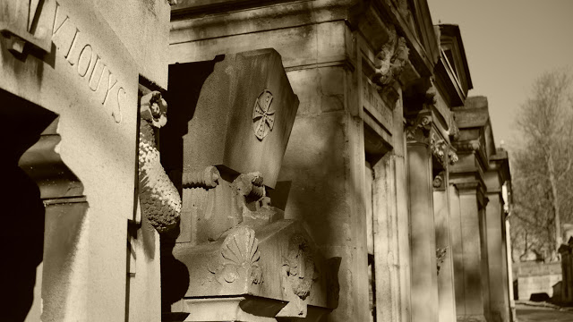 Père Lachaise έχουν συμπληρωθεί και αναδύονται πανίσχυρα μέσα σε έναν οργασμικό συνδυασμό. Τα Δέντρα σείονται εκεί ψηλά, ενώ οι Δρόμοι γίνονται λαβύρινθοι που με παγιδεύουν όλο και πιο βαθιά, οι Τάφοι βουλιάζουν κάτω από τις αιώνιες σιωπές τους ενώ κάποια από τα Αγάλματα μου γνέφουν ότι έχουν κάτι να μου πουν και με καλούν κοντά τους. Κινούμαι όλο και πιο γρήγορα, βαδίζω προς τα εκεί που ακούγονται φωνές ανθρώπων. Ένα ζευγάρι στρίβει σε ένα από τα στενά μονοπατάκια, εκείνος γύρω στα πενήντα, γκριζομάλλης με γυαλιά, εκείνη αρκετά πιο νέα τυλιγμένη σε ένα γούνινο παλτό. Τους παίρνω από πίσω μέχρι το σημείο όπου σταματούν.