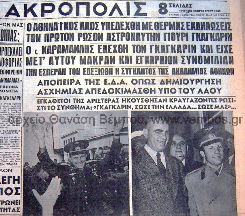 Η επίσκεψη του πρώτου διαστημικού ταξιδιώτη υπήρξε ένα από τα σημαντικά γεγονότα εκείνης της χρονιάς. Ο Γεράσιμος Σταύρου στην επιφυλλίδα του (Αυγή, 17.2.1962) κάνει μια πολύ επιτυχημένη επισήμανση. «Ο καινούργιος άνθρωπος είναι ο ταξιδιώτης, ο ποιητής του Διαστήματος. Αυτός, με τη δύναμη της γνώσης του, με τη δύναμη της επιστήμης και το χαμόγελό του, επιβάλλεται σήμερα. Κρατάει το κλειδί κι ανοίγει τις πιο απρόσιτες καρδιές, όπως άνοιξε τις πύλες του Σύμπαντος. Έχοντας δυο μέρες κοντά μας τον Γιούρι Γκαγκάριν νιώσαμε σα να ζήσαμε τα τολμηρότερα όνειρα, την ευτυχία του μέλλοντος». Ρεαλιστικότερα, ο Γ. Καράγιωργας γράφει στο Έθνος (15.2.1962). «Πειστικός ο Γιούρι Γκαγκάριν. Συναρπαστικός και αληθινός. Και όμως, όταν φεύγη, αφίνει πίσω του πολύν σκεπτικισμόν. Είναι οξύμωρον, το φαινόμενον ενός επισμηναγού φορτωμένου με στρατιωτικά μετάλλια, ενός χειριστού διαστημοπλοίου, που το ‘οδηγεί κατά βούλησιν’ προς οποιοδήποτε σημείον της Γης επιθυμήση ή διαταχθή ν’ αγνοή τας απειλάς του Ρώσου Πρωθυπουργού, τα πυρετώδη προγράμματα εξοπλισμών, τας πυραυλικάς εξελίξεις και τον Μαραθώνιον μεταξύ των δυο κόσμων προς απόκτησιν μεγαλυτέρας αεροδιαστημικής ισχύος… Αύριον, όταν ο πεζοναύτης Γκλεν πετάξη με το καλό, και μας απαγγείλη και αυτός φιλειρηνικόν του λογύδριον, πάλιν τον ίδιον σκεπτικισμόν θα προκαλέση. Πώς να μην μεταβληθούν τα διαστημόπλοια σε πολεμικές μηχανές, όταν ο άνθρωπος μετέβαλε τις ‘Βέσπες’ σε αντιαρματικά και τα στυλό του σε βόμβες;».