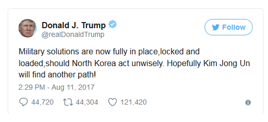 «Τα αμερικανικά οπλικά συστήματα είναι «κλειδωμένα και οπλισμένα» είπε ο πρόεδρος των ΗΠΑ«Οι στρατιωτικές επιλογές βρίσκονται σε ετοιμότητα, κλειδωμένες και οπλισμένες, εάν η Βόρεια Κορέα ενεργήσει με ασύνετο τρόπο. Ελπίζω ότι ο Κιμ Γιονγκ-ουν θα βρει κάποιον άλλο δρόμο!», έγραψε στο Twitter ο πρόεδρος των ΗΠΑ.
