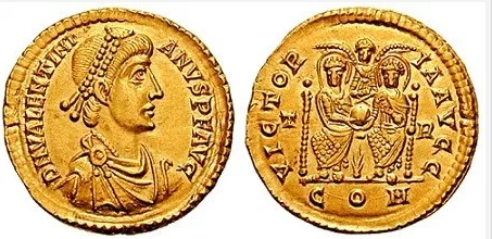Στον οπισθότυπο του νομίσματος που κόπηκε από τον Ουαλεντινινό II, απεικονίζονται ο Ουαλεντινιανός και ο Θεοδόσιος με άλω και τα σύμβολα της σφαίρας και του σταυρού.