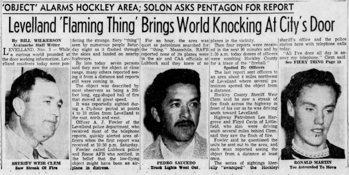 Το βράδυ της 2ης Νοεμβρίου 1957, δύο μετανάστες εργάτες γης, ο Pedro Saucedo και ο Joe Salaz, κάλεσαν το αστυνομικό τμήμα του Λέβελαντ για να αναφέρουν την θέαση ενός UFO. Ο Saucedo είπε στον αστυνομικό A.J. Fowler, ο οποίος ήταν ο αξιωματικός υπηρεσίας στο αστυνομικό τμήμα, ότι οδηγούσαν 6 χλμ δυτικά του Λέβελαντ όταν είδαν μια μπλε λάμψη κοντά στο δρόμο.